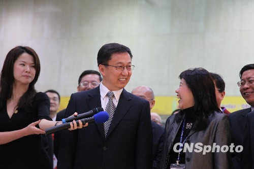 4月6日上午11時許,上海市長韓正率團搭乘班機抵達臺北松山機場,展開以深化雙城合作、推介上海世博為主軸的“攜進之旅”。圖為韓正在機場入境大廳向記者發(fā)表簡短講話,與臺北市副市長李永萍相視一笑。 中新社發(fā) 董會峰 攝