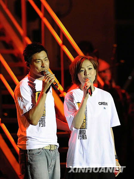 8月17日,在香港舉行的賑災(zāi)義演中,香港藝人劉德華(左)與鄭秀文演唱《喝彩》。新華社記者陳鐸攝