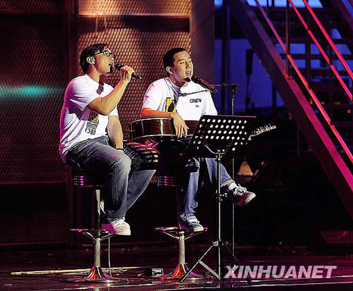 8月17日,在香港舉行的賑災(zāi)義演中,香港藝人陳奕迅(左)和房祖名演唱《一路走好》。新華社記者陳鐸攝