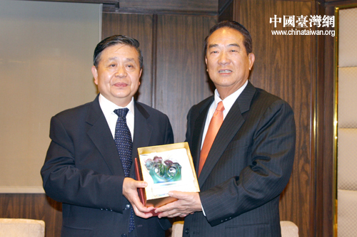 3月19日,海協(xié)會副會長王富卿率民族暨宗教交流訪問團一行訪問臺灣。圖為:親民黨主席宋楚瑜向海協(xié)會副會長王富卿贈送紀念品。 (中國臺灣網(wǎng) 黃建文 攝)