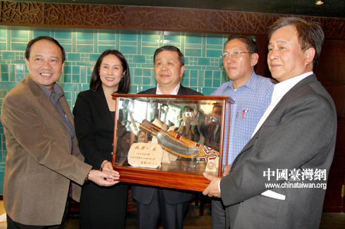 3月19日中午,海協(xié)會副會長王富卿率民族暨宗教交流團一行會見臺灣民意代表高金素梅等。圖為:高金素梅向王富卿副會長贈送紀念品。 (中國臺灣網(wǎng) 黃建文 攝)