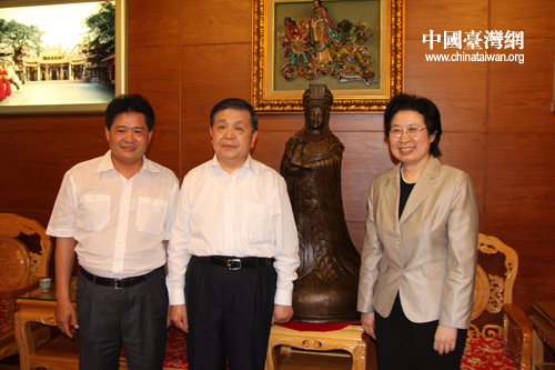 3月20日,海協(xié)會副會長王富卿率民族暨宗教交流團一行訪問臺灣媽祖聯(lián)誼會。圖為:王富卿副會長(中)、張勝林副秘書長(右一)與臺灣媽祖聯(lián)誼會負責人鄭銘坤(左一)合影。 (中國臺灣網(wǎng) 黃建文 攝)