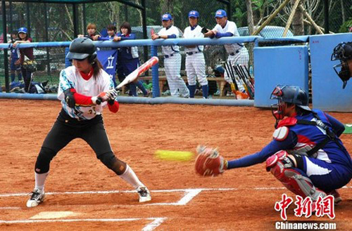 4月2日下午,“2011楠景新城杯·海峽兩岸女子壘球賽”在云南西雙版納楠景新城棒壘球訓練基地舉行。圖為臺北體育學院隊與廣東女壘進行比賽。 中新社發(fā) 楊穎融 攝