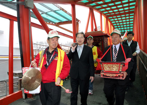 中新網(wǎng)4月11日電 據(jù)“中央社”報(bào)道,金門縣烈?guī)Z鄉(xiāng)保生大帝進(jìn)香團(tuán),11日經(jīng)由“小三通”前進(jìn)大陸祖廟謁祖交流,金門縣長李沃士到碼頭為神明抬轎送行,祈祝庇佑平安。