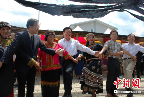 5月22日,四川省長(zhǎng)蔣巨峰一行探訪臺(tái)灣高雄杉林鄉(xiāng)大愛(ài)園區(qū),向當(dāng)?shù)赜懡虨?zāi)后重建經(jīng)驗(yàn),并與受“8·8”風(fēng)災(zāi)影響遷移到園區(qū)的民眾手拉手跳舞。中新社發(fā) 劉賢 攝