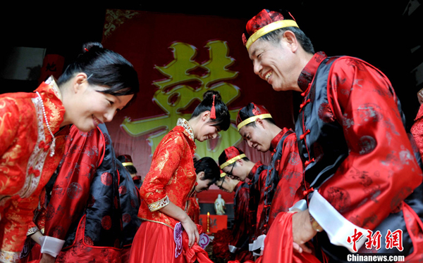 8月3日,來(lái)自海峽兩岸的16對(duì)新人在福建泰寧尚書(shū)第古厝里舉行客家民俗婚禮。當(dāng)日,由臺(tái)灣南投與福建泰寧攜手“情定泰寧·合歡南投”兩岸新人秀活動(dòng)正式啟動(dòng),兩地縣長(zhǎng)共同見(jiàn)證了16對(duì)新人的傳統(tǒng)客家婚禮儀式。中新社發(fā) 王東明 攝
