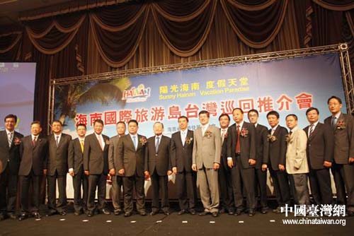 海南省旅游代表團在臺灣舉辦海南國際旅游島旅游推介會,圖為主要與會嘉賓合影。(圖片來源:海南省臺辦)