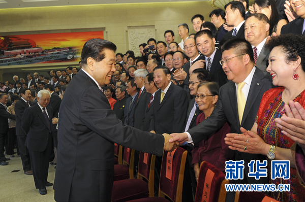 6月19日,中共中央政治局常委、全國政協(xié)主席、中國和平統(tǒng)一促進(jìn)會(huì)會(huì)長賈慶林在北京會(huì)見出席中國和平統(tǒng)一促進(jìn)會(huì)八屆二次理事大會(huì)的全體代表。新華社記者 饒愛民 攝