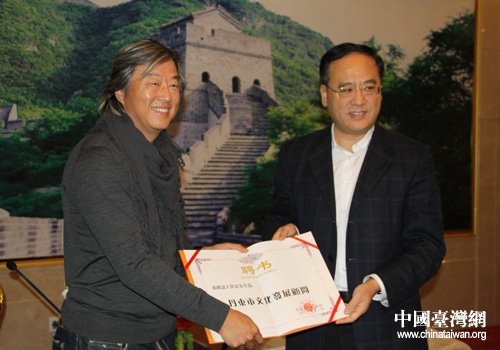 中國(guó)臺(tái)灣網(wǎng)11月17日丹東消息 日前,丹東市代市長(zhǎng)石光在丹東賓館會(huì)見了臺(tái)灣金星娛樂事業(yè)有限公司總經(jīng)理王偉忠、臺(tái)灣海悅廣告股份有限公司董事長(zhǎng)黃希文等臺(tái)灣客人,并聘請(qǐng)王偉忠、黃希文為“丹東市文化發(fā)展顧問”,向二人頒發(fā)了聘書。