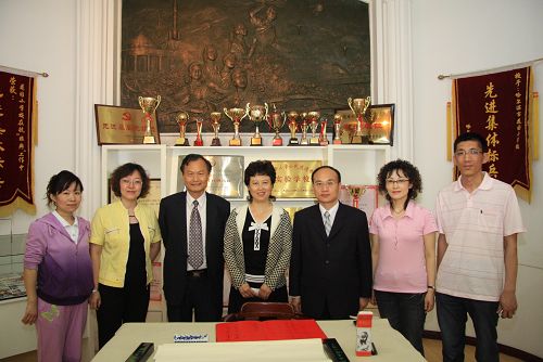 和哈爾濱市花園小學教師合影留念,臺北市教育局副局長曾燦金(右三),臺北市博愛小學校長蘇再添(左三)