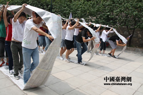 中國臺灣網8月18日太原消息 選隊長、做隊旗、編隊歌……太原中北大學里兩岸青年正在興奮地進行著拓展競賽,這是很多臺灣團員第一次參加拓展訓練,也是中北大學的同學們第一次迎接來自寶島臺灣的同齡人,原本的距離感、陌生感很快就被同齡人之間特有的語言、興趣、愛好所打破。討論的包容、協(xié)作的默契,兩岸青年很快溶入進團隊合作的大家庭中。拓展訓練的開始,也標志著為期一周的“華夏文明看山西——兩岸青年黃河行”活動正式拉開帷幕。
