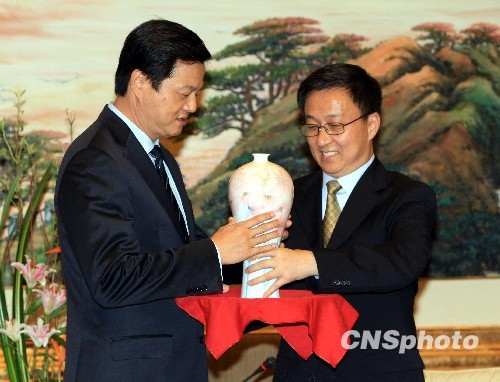 10月15日,上海市長韓正(右)在上海衡山賓館會見臺北縣長周錫瑋一行。韓正向周錫瑋贈“傾心向陽”釉下彩,體現(xiàn)人們對世博會的向往之情。 中新社發(fā) 潘索菲 攝