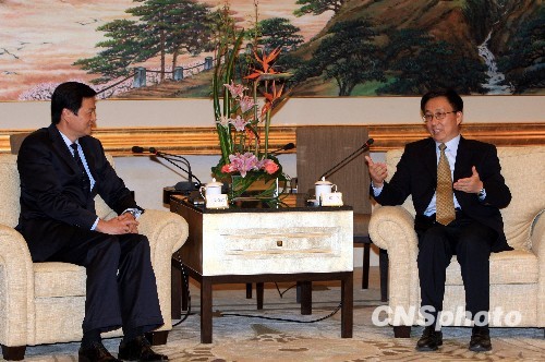 10月15日,上海市長韓正(右)在上海衡山賓館會見臺北縣長周錫瑋一行,雙方就治理城市水污染問題進行了交流。周錫瑋一行將在上海重點考察蘇州河、洋山深水港等。 中新社發(fā) 潘索菲 攝