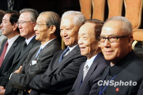 11月13日,為期兩天的“兩岸一甲子”學(xué)術(shù)研討會在臺北開幕。由于一百一十多位兩岸與會學(xué)者中,有多位接近兩岸決策核心的重量級智囊學(xué)者,而探討的是兩岸在政治、經(jīng)濟、文化、軍事、涉外事務(wù)等領(lǐng)域的諸多敏感議題,研討會廣受媒體關(guān)注。圖為中國戰(zhàn)略與管理研究會會長、中共中央黨校原常務(wù)副校長鄭必堅(右三),中國孫子兵法研究會名譽會長李際均(右一)等與會專家學(xué)者合影。 中新社發(fā) 黃少華 攝