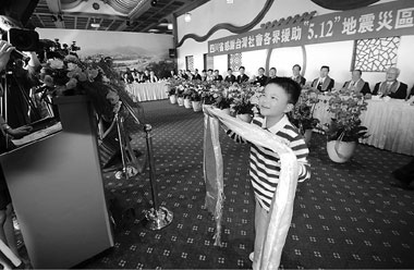 抗震救災(zāi)小英雄林浩向臺灣媒體敬獻哈達和羌紅,感謝他們?yōu)榭拐鹁葹?zāi)做出的貢獻。