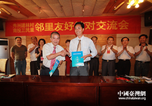 臺灣南投縣三民里與浙江嘉興市秀洲區(qū)王店鎮(zhèn)建林村簽訂兩岸鄰里交流意向書(圖片來源:嘉興市臺辦)