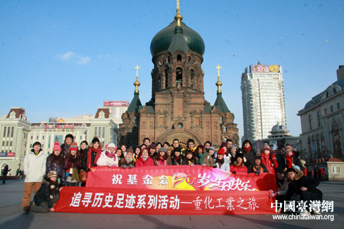兩岸青年學(xué)子在哈爾濱圣索菲亞大教堂合影留念。(中國臺灣網(wǎng) 于斯文 攝)