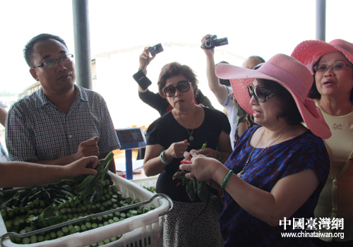 臺(tái)灣嘉賓在永寧供港蔬菜基地參觀時(shí),詢(xún)問(wèn)相關(guān)人員蔬菜的有關(guān)情況。(中國(guó)臺(tái)灣網(wǎng) 李瑞艷 攝)
