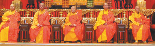 2012海峽兩岸和平法會(huì)由兩岸高僧,(左起)杭州靈隱寺住持光泉大和尚、臺(tái)灣中臺(tái)禪寺住持見(jiàn)燈法師、中臺(tái)禪寺開(kāi)山方丈惟覺(jué)、中國(guó)佛教協(xié)會(huì)副會(huì)長(zhǎng)學(xué)誠(chéng)大和尚及一新蘭若知量大和尚,擔(dān)任“主法五大士”。(圖片來(lái)源:臺(tái)灣《聯(lián)合報(bào)》)