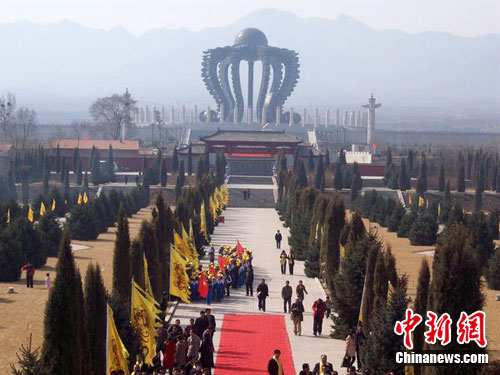 圖為黃帝城全景,遠處為“中華合符壇”,巍巍壯觀,56根民族圖騰柱是中華合符壇工程的主體部分,安裝在中華合符壇中央九龍柱的外圍,代表著五十六個民族都是龍的傳人,象征著中華民族的大團結、大融合。中新網發(fā) 譚地 攝