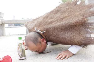 昨天下午在鼓浪嶼鄭成功石像底下,身披蓑衣、頭戴斗笠一副“苦行者”打扮的“臺(tái)灣阿成”吸引了許多人的眼光,他趴在地上親吻土地的舉動(dòng)更是吸引了許多游客前來圍觀。“廈門是我大陸之旅的首站,非常成功!庇H吻動(dòng)作完成后,他邊抹嘴唇的泥沙邊笑著對(duì)記者說:“這第一吻有成功的味道。”