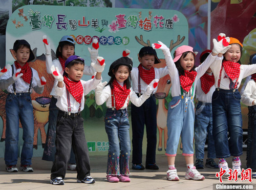 4月7日,臺(tái)北市立動(dòng)物園為臺(tái)灣同胞回贈(zèng)大陸同胞的長鬃山羊(“喜羊羊”和“樂羊羊”)和梅花鹿(“繁星”和“點(diǎn)點(diǎn)”)舉行祈;顒(dòng),它們即將在16日啟程赴山東劉公島。這場名為“永保安康——為長鬃山羊與梅花鹿祈!钡幕顒(dòng)吸引了近百名幼兒園小朋友和小學(xué)生參加。圖為祈福儀式上,臺(tái)北小朋友跳起自編自演的動(dòng)物舞蹈。路梅 攝