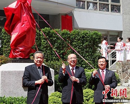 安徽省長(zhǎng)王三運(yùn)20日率安徽省經(jīng)貿(mào)文化參訪團(tuán)來(lái)到臺(tái)灣銘傳大學(xué)桃園校區(qū),向該校贈(zèng)送一尊劉銘傳銅像。圖為王三運(yùn)(右)與中國(guó)國(guó)民黨榮譽(yù)主席吳伯雄(中)、銘傳大學(xué)校長(zhǎng)李銓?zhuān)ㄗ螅┕餐瑸殂~像揭幕。中新社發(fā) 路梅 攝