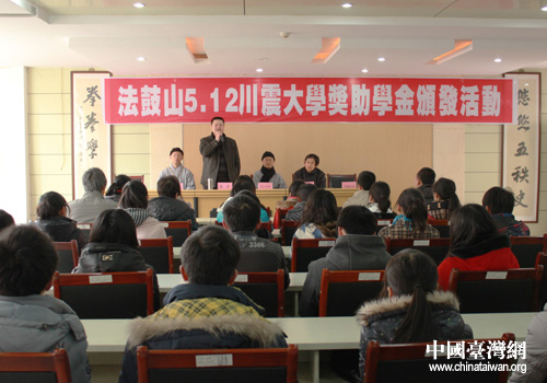 中國臺(tái)灣網(wǎng)2月22日綿陽消息 日前,臺(tái)灣法鼓山慈善基金會(huì)果品法師一行在綿陽中學(xué)為綿陽中學(xué)、安縣中學(xué)等40名災(zāi)區(qū)貧困優(yōu)秀學(xué)生發(fā)放了助學(xué)金。這是臺(tái)灣法鼓山慈善基金會(huì)自“5.12”汶川特大地震發(fā)生以來第九次向綿陽優(yōu)秀貧困學(xué)子頒發(fā)獎(jiǎng)助學(xué)金。綿陽市臺(tái)辦副主任李軍出席獎(jiǎng)助學(xué)金頒發(fā)活動(dòng)。
