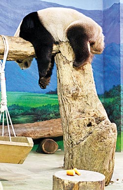 大熊貓“圓圓”雖出現(xiàn)發(fā)情跡象,但15日卻在室內(nèi)倒頭大睡,連午餐都沒(méi)吃。(來(lái)源:臺(tái)灣《中國(guó)時(shí)報(bào)》)