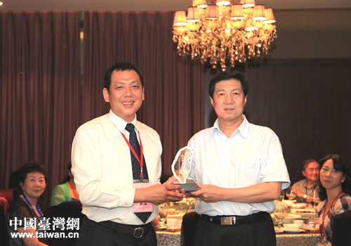 臺灣中華兩岸婚姻協(xié)調(diào)促進會理事長鐘錦明(左)向省臺辦副主任周越明贈送紀念品。(云南省臺辦 李仁興 攝)