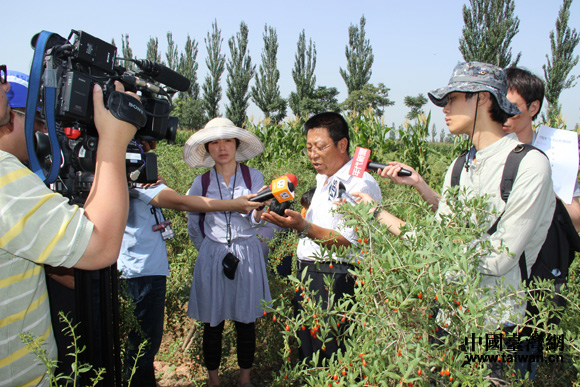 中國(guó)臺(tái)灣網(wǎng)7月30日銀川消息 30日上午,“海峽兩岸記者西北行”聯(lián)合采訪團(tuán)來(lái)到中國(guó)枸杞之鄉(xiāng)——寧夏回族自治區(qū)中衛(wèi)市中寧縣,中寧縣有關(guān)領(lǐng)導(dǎo)向兩岸記者介紹了中寧枸杞的栽培歷史以及目前種植和外銷(xiāo)情況等,并請(qǐng)兩岸記者團(tuán)觀賞了中寧萬(wàn)畝枸杞觀賞園,還帶領(lǐng)兩岸記者團(tuán)深入田間地頭,親自觀摩枸杞的生長(zhǎng)情況及種植技術(shù)。