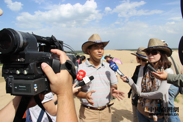 沙湖管理人員向兩岸記者介紹沙湖旅游開(kāi)發(fā)情況。(中國(guó)臺(tái)灣網(wǎng) 王文英 攝)