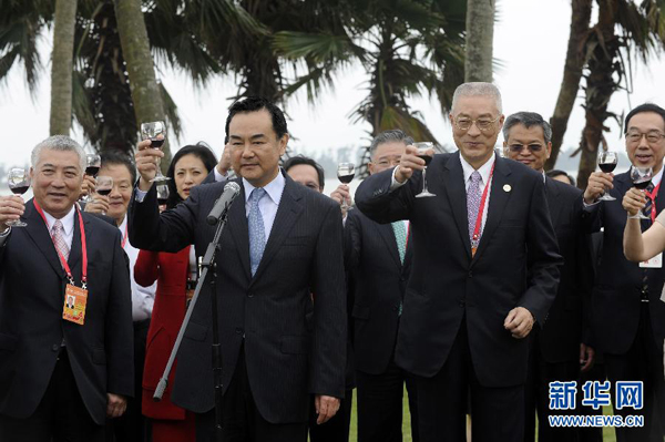 4月1日,中共中央臺(tái)辦、國(guó)務(wù)院臺(tái)辦主任王毅在海南博鰲舉行招待酒會(huì),歡迎前來(lái)出席博鰲亞洲論壇的臺(tái)灣兩岸共同市場(chǎng)基金會(huì)名譽(yù)團(tuán)長(zhǎng)吳敦義一行。新華社記者金良快攝