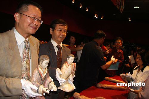 圖為臺灣金傳媒集團執(zhí)行長楊仁烽(左一)、臺北歷史博物館館長黃永川(左二)面帶微笑,向記者展示彩繪女陶俑。中新社發(fā) 董會峰 攝