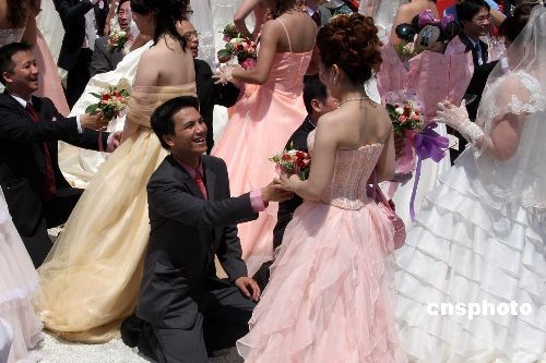 6月28日,50對新人頂著烈日,參加在臺(tái)北縣板橋市435藝文中心舉行的露天集體婚禮,現(xiàn)場安排乘坐越野車入場、求婚、擁吻等環(huán)節(jié),場面溫馨而又火爆。圖為眾新郎右膝著地,向新娘獻(xiàn)花、求婚。中新社發(fā) 董會(huì)峰 攝