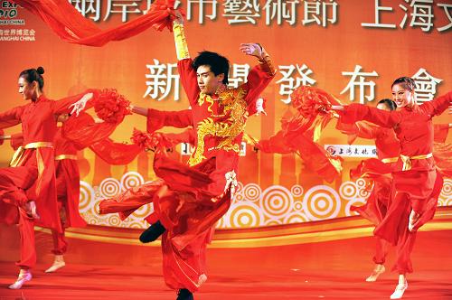 10月15日,國(guó)家一級(jí)演員黃豆豆(中)與上海戲劇學(xué)院舞蹈學(xué)院的演員們?cè)谛侣劙l(fā)布會(huì)上表演舞蹈《龍騰虎躍》。當(dāng)日,“兩岸城市藝術(shù)節(jié)——上海文化周”新聞發(fā)布會(huì)在臺(tái)北舉行,向臺(tái)灣媒體介紹本次藝術(shù)節(jié)的各項(xiàng)活動(dòng)。“上海文化周”活動(dòng)于10月13日至25日在臺(tái)北市舉行,期間將舉辦雜技演出、昆曲演出、上海電影展、兩岸城市文化論壇等活動(dòng)。新華社發(fā)(吳景騰 攝)