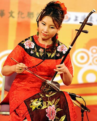 10月15日,國(guó)家一級(jí)演員馬曉暉在新聞發(fā)布會(huì)上表演二胡獨(dú)奏《草原賽馬》。新華社發(fā)(吳景騰 攝)