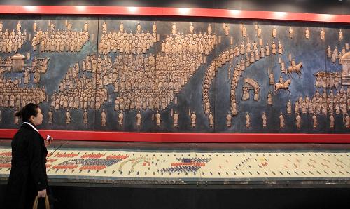 10月28日,觀眾在北京舉行的“海峽兩岸書畫家交流活動作品展”上欣賞巨型銅雕作品《大駕鹵簿圖》。 當(dāng)日,“和諧中華·海峽兩岸書畫家交流活動作品展”在北京開幕。海峽兩岸近萬件書畫作品中遴選出的近500件精品佳作參展。新華社發(fā)(羅偉 攝)