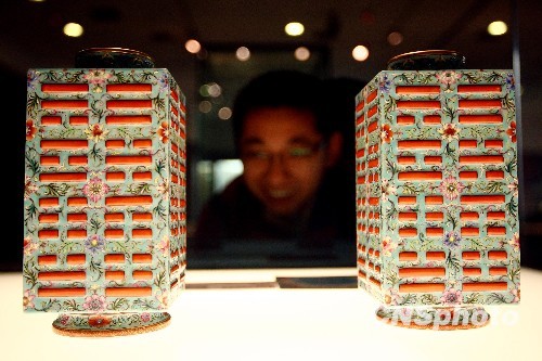圖為松石綠地粉彩纏枝花卉八卦紋琮式瓶(一對(duì))。中新社發(fā) 杜洋 攝
