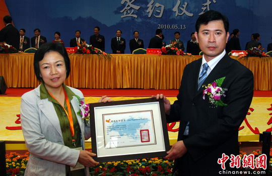 5月14日,高雄市聯(lián)合貿(mào)易促進(jìn)會(右)與中國貿(mào)促會南平支會(左)雙方代表在武夷山簽約締結(jié)為姐妹會,第十三屆海峽西岸武夷國際投資洽談會大會為二會頒發(fā)締結(jié)友好證書。高雄市聯(lián)合貿(mào)易促進(jìn)會何主任表示,兩地貿(mào)促會簽約后首先進(jìn)行今年茶博會項目的合作,屆時兩地茶商可以有更好的平臺進(jìn)行交流。中新社發(fā) 張麗君 攝