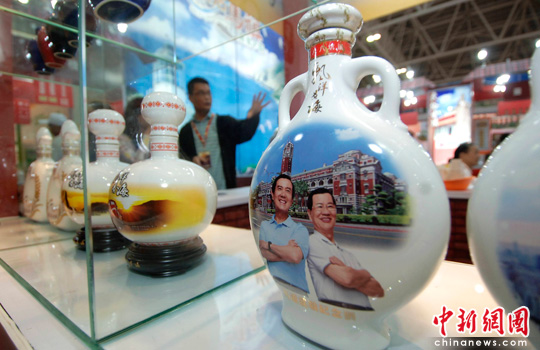 5月18日,貼有馬英九、蕭萬長肖像的臺灣白酒亮相第十二屆海交會。當日,由國臺辦、中國貿(mào)促會、海關(guān)總署、國家質(zhì)檢總局和福建省政府共同主辦的第十二屆海峽兩岸經(jīng)貿(mào)交易會、第七屆中國福建商品交易會在新落成的福州海峽國際會展中心開幕,近萬名海內(nèi)外客商赴會。中新社發(fā) 王東明 攝