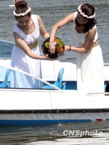 25日下午,由臺灣南投縣縣長李朝卿帶來的一壇日月潭水緩緩注入位于吉林省長春市的凈月潭內(nèi),兩個姊妹潭的潭水瞬間融在一起。同時,一艘命名為“日月潭號”的游船在長春凈月潭投入使用。