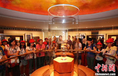 圖為成都金沙遺址博物館內(nèi)的“太陽神鳥”吸引臺灣學(xué)生。中新社發(fā) 劉忠俊 攝