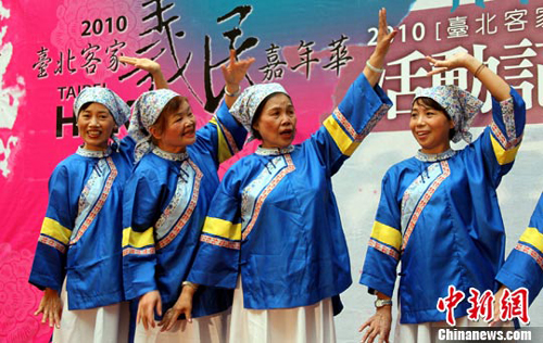 10月12日,2010年臺(tái)北客家義民嘉年華在臺(tái)北舉行發(fā)布會(huì)。圖為穿著客家傳統(tǒng)服裝前來(lái)參加發(fā)布會(huì)的島內(nèi)客家鄉(xiāng)親,現(xiàn)場(chǎng)為嘉年華活動(dòng)造勢(shì)。 中新社發(fā) 王健 攝