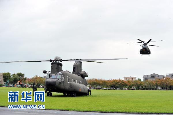 10月28日,救援運(yùn)輸機(jī)在進(jìn)行起飛前準(zhǔn)備。當(dāng)日,臺灣宜蘭蘇花公路塌方救援行動(dòng)在陣雨中繼續(xù)進(jìn)行,臺方出動(dòng)200多人進(jìn)行搜救,并動(dòng)用運(yùn)輸直升機(jī)運(yùn)送一輛小型挖土機(jī)至114.5公里路段進(jìn)行救援。救援人員還將視天氣情況增運(yùn)5輛小型挖土機(jī)前往搜救點(diǎn)。新華社記者何俊昌 攝