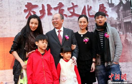 根據(jù)老舍代表作《四世同堂》改編的同名話劇定于30日在臺北孫中山紀念館開啟首演大幕,被形容為“明星陣容”的劇中演員29日齊齊亮相臺北,為該劇首演造勢。這是大陸新編排的話劇,首次選擇臺灣作為首演地。圖為劇中的“祁家”——飾演祁老爺子的雷恪生、飾演祁瑞宣的黃磊、飾演韻梅的朱媛媛、飾演胖菊子的陶虹,以及從臺灣選出的兩名飾演孩子的演員,一同登臺亮相。中新社記者 王健 攝