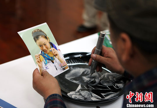 12月4日,吉林瓷刻藝術(shù)家劉世杰在臺(tái)中市展覽現(xiàn)場,以在廣州亞運(yùn)上奪得2塊金牌的中華臺(tái)北運(yùn)動(dòng)員詹詠然為題材,創(chuàng)作瓷盤雕刻!2010吉林市文化藝術(shù)展覽”在臺(tái)中市開幕,吉林市多位著名藝術(shù)家的書法、水墨、篆刻、剪紙逾200幅作品參展。展覽以關(guān)東風(fēng)情、冰雪文化為主題,將持續(xù)至明年1月23日,為臺(tái)中市民帶來跨年度的藝術(shù)盛宴。