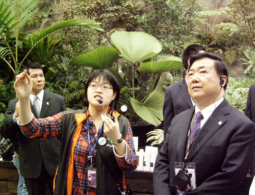安徽省長王三運(右)18日下午參觀臺北花博新生園區(qū),在“未來館”內(nèi)聆聽導(dǎo)覽員解說。 圖片來源:“中央社”