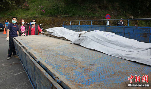 4月27日,臺(tái)灣阿里山景區(qū)發(fā)生小火車翻車事故,現(xiàn)場被當(dāng)?shù)鼐椒怄i。下午5點(diǎn),最后兩個(gè)大陸游客遇難者遺體被抬上直升飛機(jī)。中新社發(fā) 沈存旭 攝