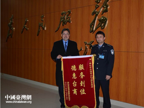 2011年,市臺辦促成車管所向上爭取將境外人員駕駛證補換業(yè)務(wù)下放的意向,并以吳江臺協(xié)名義向吳江車管所提交書面申請,經(jīng)其不懈努力,蘇州車管所終于將該業(yè)務(wù)權(quán)限下放到吳江,并將實施范圍擴大至蘇州其他縣市,12月開通了辦理境外人員駕駛證補換證業(yè)務(wù)的“綠色通道”。對臺商來說,不但省去了往返吳江和蘇州的路程,而且如果證件遺失也能夠及時補齊,節(jié)省了不少時間和麻煩,極大地方便了臺胞。為示感謝,市臺辦領(lǐng)導(dǎo)與市臺協(xié)會長齊治一起,向吳江車管所呈送了錦旗。(中國臺灣網(wǎng)、吳江市臺辦聯(lián)合報道)